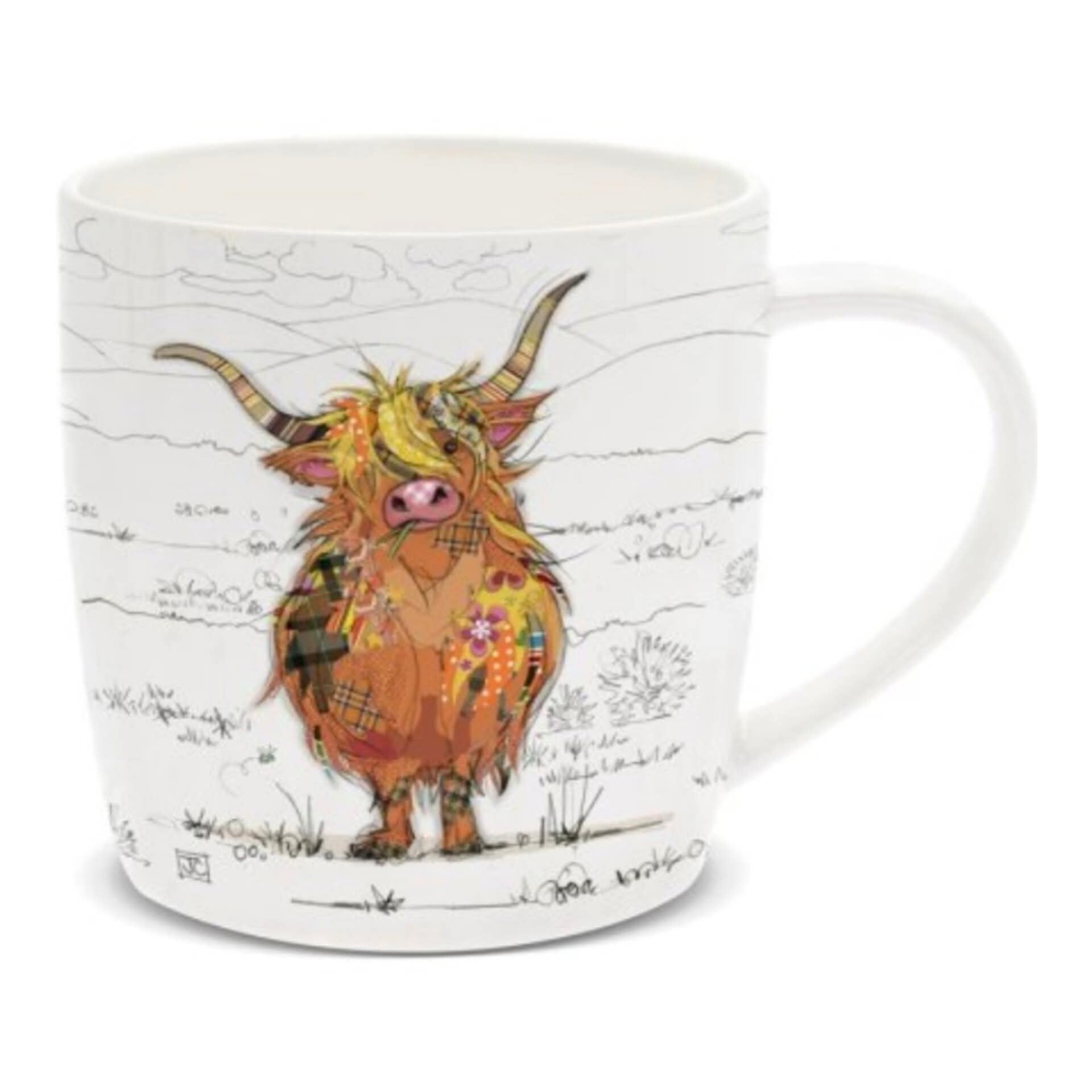A fine china mug with artist Bug Art's colourful Hamish Highland Cow.