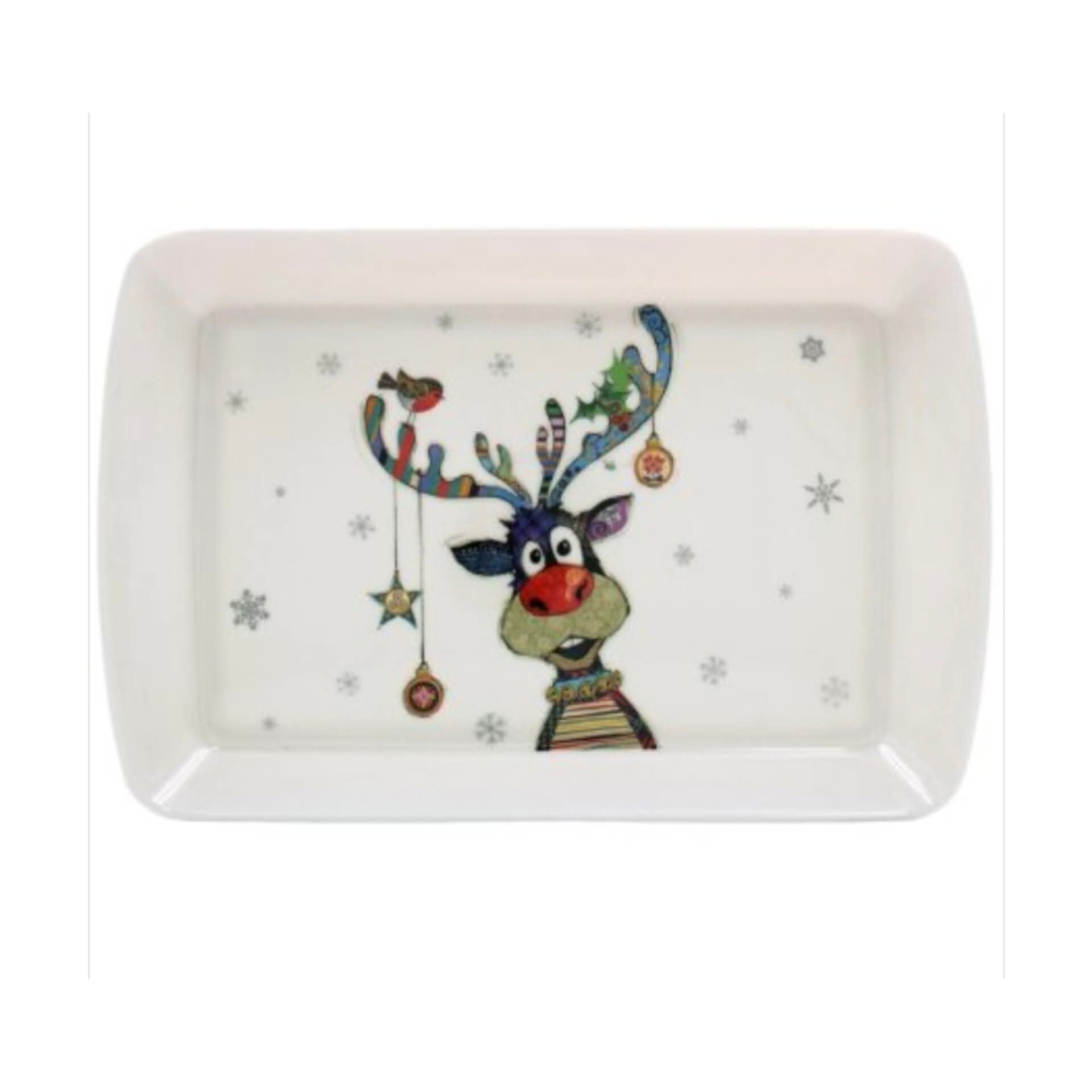 A festive tray with a illustration of a quirky reindeer. The perfect size to enjoy tea and cake. Detailing a reindeer with an assortment of baubles and decorations hung from its antlers.