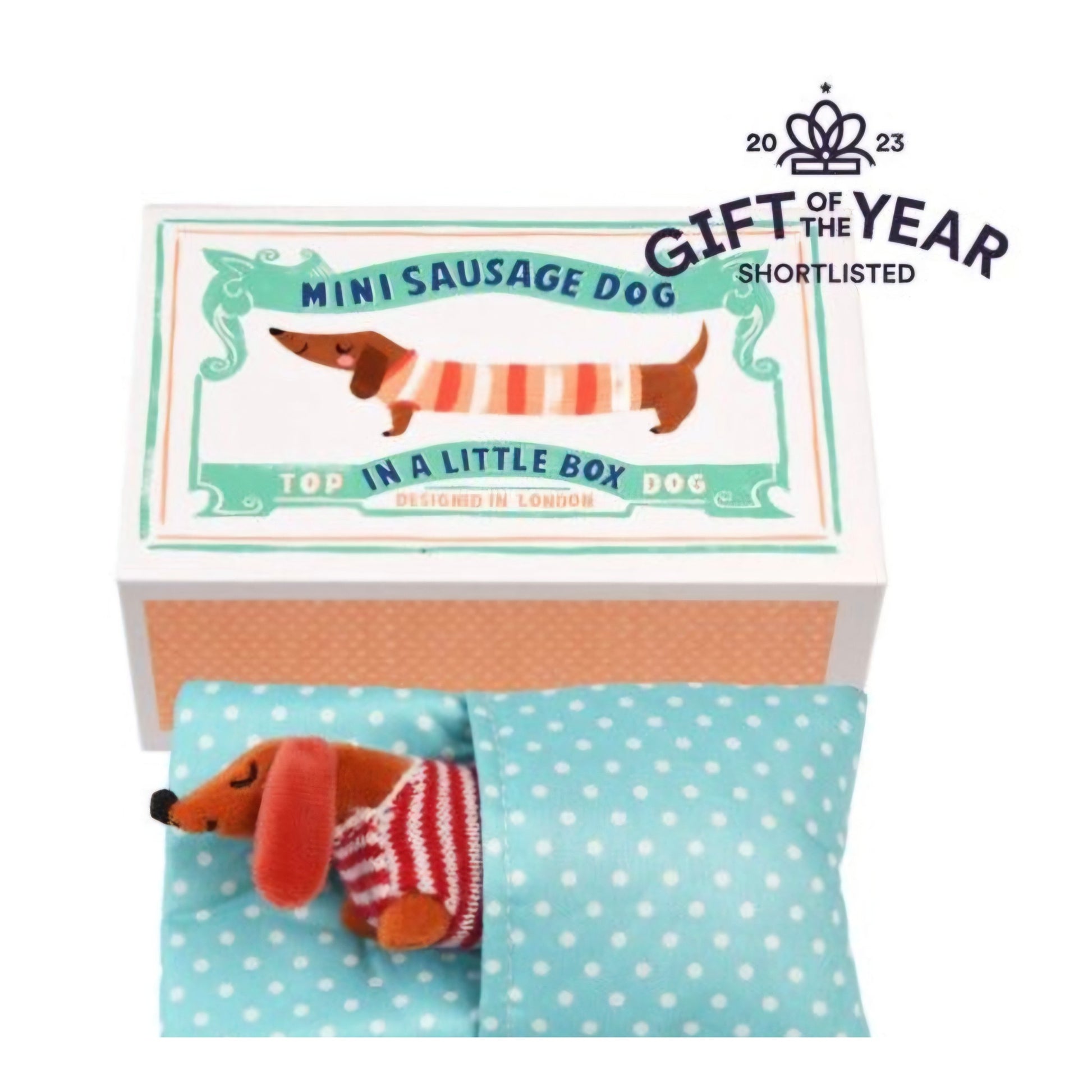 An adorable little sausage dog soft toy in a striped jumper with polka dot bed presented in an illustrated box.